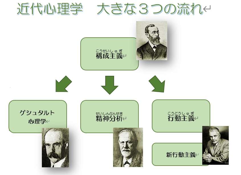 近代心理学はWundtから始まりました。3つの主要な流れに分岐していますが、それらの流れの中でもさらに細かい分岐が見受けられます。基本的に、Wundtからこの学問が発展してきたのです。